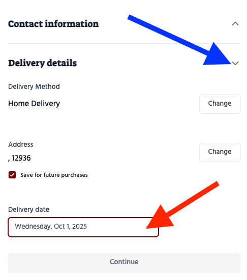 Click on "Delivery Details" indicated by the BLUE arrow. This drops down more delivery options. Then select your preferred delivery date from the drop down menu shown by the RED arrow.
